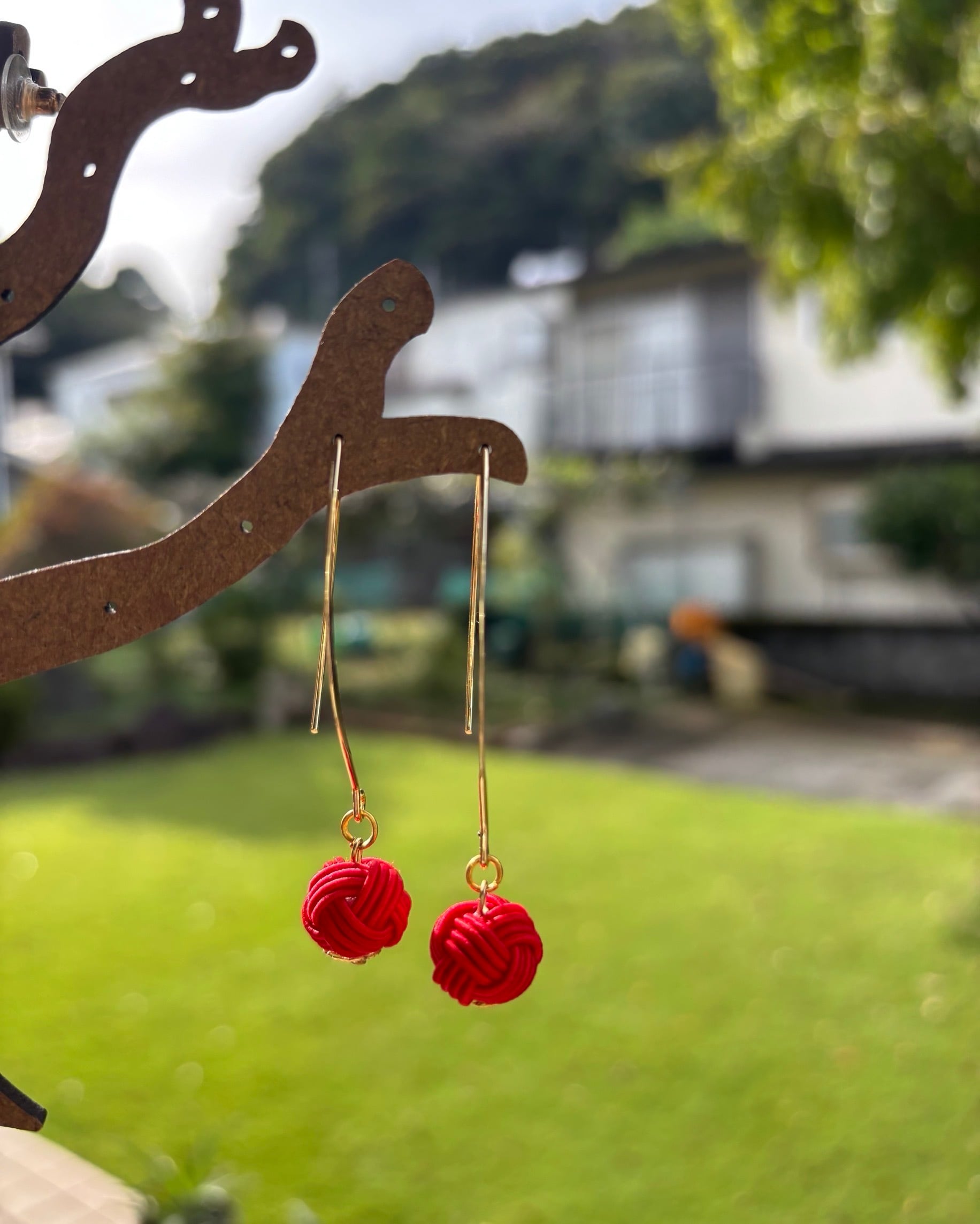 鮮やかな紅色の玉結びを、シンプルなゴールドのロングフックに通して。 すっきりとした縦のラインが、首元を軽やかに見せます。 どんな日の装いにも溶け込む、さりげない彩り。 素材:水引、ゴールド金具 ハンドメイドのため、ひとつひとつ表情が異なります。
